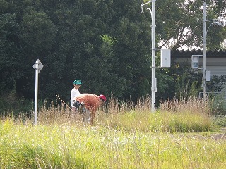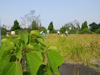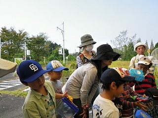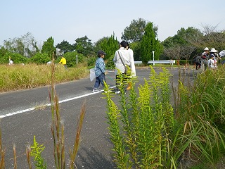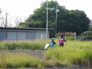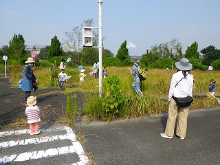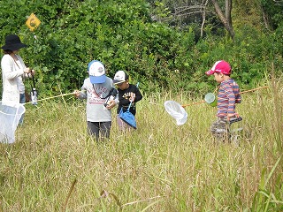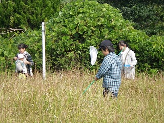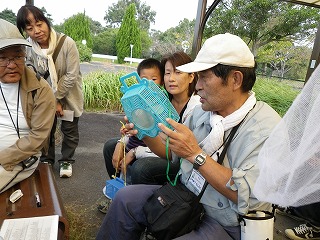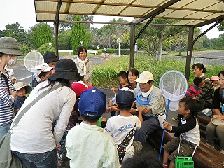 観察会への事前予約は11家族33名、当日の参加者、指導員を含め47名になりました。当日は幼い子どもが多かったので、活動範囲を旧交通センター一角の草地と東屋に限定し、「コオロギ・バッタ・キリギリス類の採集と観察(平松俊)」、「草遊び、ススキやシュロの葉でバッタ作り(中井三)」を中心に進めました。