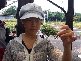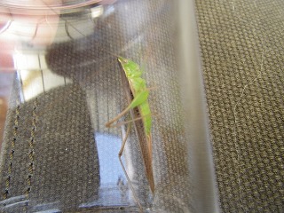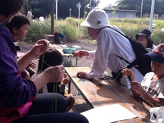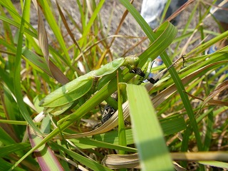 草地にはイネ科の雑草やクズの蔓が生い茂り、セイタカアワダチソウなどが目立ちました。簡単な注意事項をお願いした後、親子家族には自由に昆虫採集に勤しんでもらいました。草地のあちこちで歓声があがり、スタッフへの問いかけが交錯していました。1時間ほどで20種類ほどのバッタ類が採集され、東屋へ集って分かち合いをしました。並行して、進めた草遊びでは「ススキ・バッタ」が好評で、沢山の親子が夢中になってバッタを編み上げ、おみやげにしました。