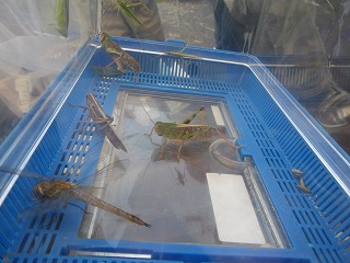 【左】採集したバッタ類の分かち合い1         【中】採集したバッタ類の分かち合い2          【右】採集したバッタ類の分かち合い3