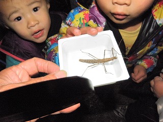 【左】トゲナナフシに代わる代わる触る子どもたち  【右】フュシャクを期待して水銀灯が灯火されました。