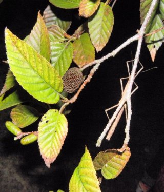 【左】ナイトハイクでたくさんの収穫がありました。    【右】ヤシャブシにとまっているトゲナナフシ