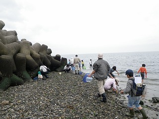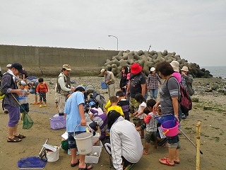 浜辺に全員を集めて、転石の下、波打ち際、消波ブロック、堤防の周囲など観 察と採集のポイントを説明し、最後にイシガニなどに指を挟まれないよう注意を 促して1時間半ほどを自由時間としました。
