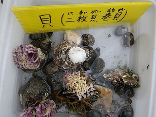 採集した生きものは海辺に準備した10個ほどのバットに分類してもらい、分か ち合いに臨みました。やや早めに全員を集め、バット毎に種名、生態などを説明 しサンプルを持ち回り、触ってもらい、質疑に応じました。名前の由来や生態の ユニークさは多くの参加者に興味を持って頂けました。