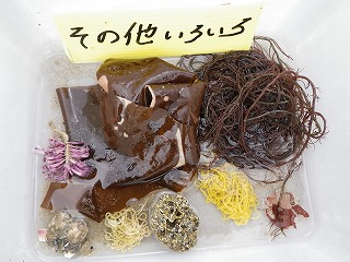 海藻の仲間・・・ワカメ、オゴノリ、アナアオサ、ミル、ツルツル(?)、アマモ(海草)、