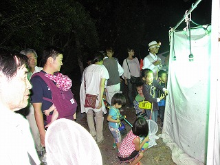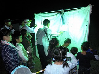 曇って蒸し暑い灯火観察には絶好の天気になりました。18:30頃から灯火装置をいつもの駐車場東側に設置し点灯、参加者を待ちました。24名もの一般参加がありにぎやかな観察会になりました。