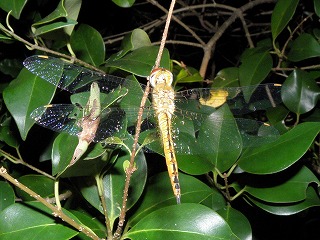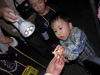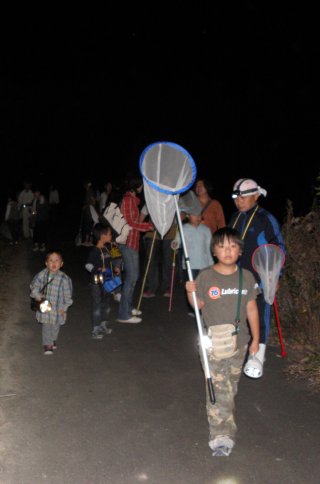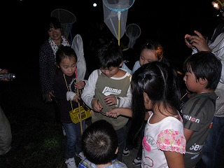 西側で浅井さんが合流し、就寝中?のギンヤンマやウスバキトンボを次々に見つけ子供たちに素手でとらせるという昼間には絶対に味わえない体験をさせたため子供たちのボルテージが一気に上がりました。また側溝のザリガニ捕りに子供が夢中になり21:00近くになったためナイトハイクを中断、灯火観察場所に戻りました。