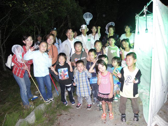 灯火にはセミやトンボなどほぼ期待通りたくさんの虫が集まっていました。集合写真を撮ってから、灯火にきた虫を説明し、21:00過ぎ楽しく観察会を終了しました。灯火に来た虫の説明がもう少し面白くできたらと反省しています。