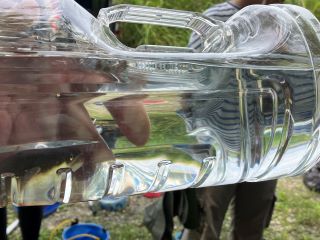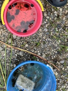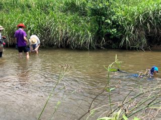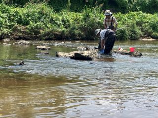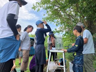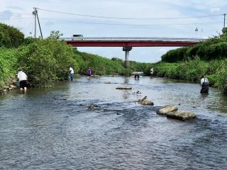 開始前の約1時間で、駐車場スペースと川へ降りるルートの草刈りをしました。体温が下がらないうちに胴長を履いたために自分が熱中症になってしまいました。開始の挨拶で注意をするように言っておいて恥ずかしい次第です。一般参加者は少なかったけどアユや、30pくらいのウナギも捕まえることができてよかったです。捕まえそこなったけど30pくらいのナマズもじっとしていたそうです。大量に水槽掃除用にイシマキガイが採集されていました。 (記 平松裕)