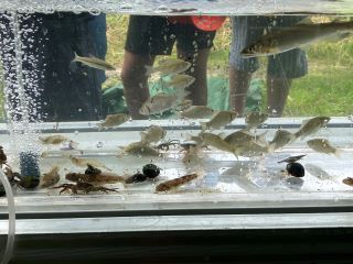 ギンブナ、ブルーギル、モツゴ、アユ、ゴクラクハゼ、ウナギ、カダヤシ、アメリカザリガニ、テナガエビ、スジエビ、ヌマエビ、モクズガニ、カワニナ、イシマキガイ、ヌマガエルオタマジャクシ、アカミミガメ、コオイムシ、アメンボ、レッドファイアーシュリンプ?