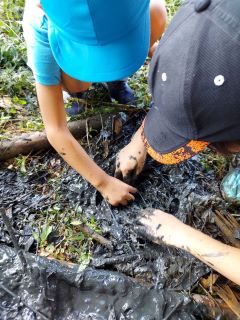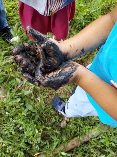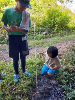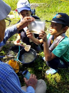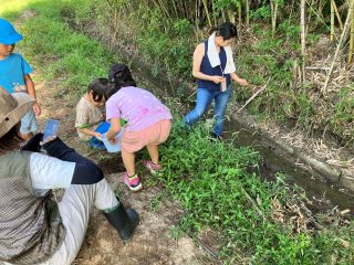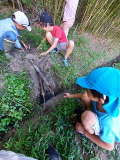 あいさつの後、竹で短い竿を作り、するめを餌にして水路のアメリカザリガニを釣ってみる。1か月くらい前に暗渠のつまり抜き工事がなされ、たくさんいたザリガニが流れて行ったみたいで、小さな個体が目立ってなかなか釣れなかった。試しに私が子どもの頃やっていたようにザリガニの頭をもいで、お腹の身では良く釣れるみたいだった。鍬で泥をすくいあげたらハゼやドジョウがいて、泥んこからドジョウを掴むことに大人も子どもも盛り上がっていた。湧き水場に手洗い場を作る子ども達も現れて、楽しい観察会でした。(記