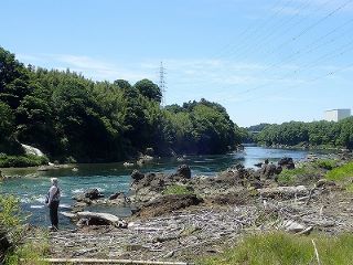 珪化木の拾える、ダムの隣の飛騨川の川辺に行くということでダムから急な坂道を降りていく。途中、イヌトクサに出会う。丸くなっている火山噴火の後もみられた。