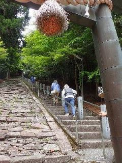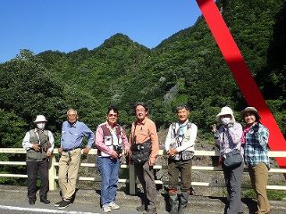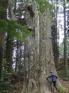 白川町の中心から車で山道を20分。やっと着いた駐車場からは遙か長い石段の表参道。これを登るのか…と思えば車道が。迷わず車道を進んだおかげで、8人全員が神社に到着。何やらお寺のような造りの境内の天井には松や鶴、唐獅子や亀などがえがかれていた。そこからさらに石段を登ると天然記念物の大杉があり、その上のほこらの奥には遠く白山を望める展望台が。眺望は今ひとつだった。残念。ユキザサやミズメ(皮をむくとサロメチーるの匂い)アズサ、ヨゾクミネバリが見られた。 (記:竹内)