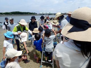 その後、捕獲した生きものを、それぞれ生きもの種類別のバット、また小魚は水槽へと移しながら「魚類」と「カニ・エビ・貝類とその他」に分けて参加者に順を追ってお話を行いました。
