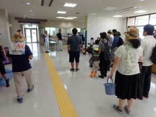 朝方雨がちらつき心配しましたが、その後晴れ上がり、今日も暑い日となりました。  未来館からの挨拶、及び指導員から出発前にトイレを済ませることや、特に水路でのタモの扱い方や魚類の捕獲の仕方などについて説明後、いざ出発!