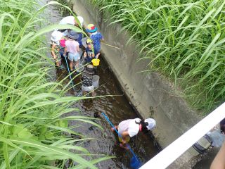神田川の観察場所に着くと、早速子供たちは水路に入りたがり、水路に入ると水深が15cmmほどであったことからこども用長靴に水が入ってしまいましたが、すぐにタモで魚などの捕獲に夢中でした。