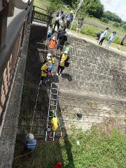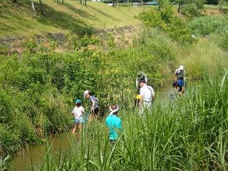 参加者は環境課を通しての参加者と、豊田自動織機関係、イオンのTシャツを着た参加者でちょうどいいくらいの参加者の数となった。前日も雨が降らなかったせいもあってか水は思ったより少なく、かいどりにはちょうどよい深さ。はしごを下りると思い思いに水の中へ。ハグロトンボがひらひらと空を舞う姿もあった。