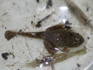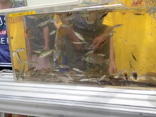 人が多いというのはすごいもので、1時間と少しの時間でたくさんの生き物が採集できた。エビしか捕れないと嘆く子供がいる一方でちゃんとウナギを捕らえている大人もいた。濁った川の水に泳ぐ魚を澄んだきれいな水の水槽に入れると、姿形がはっきりし、特徴もよくわかる。種類ごとにどんな生き物なのか、詳しい説明を聞いた。しっぽの残っている食用ガエルのオタマジャクシが採れ、みんなの視線が集まった。また、イケメン鮎くんも注目の的だった。 (記 竹内秀)