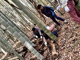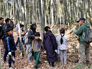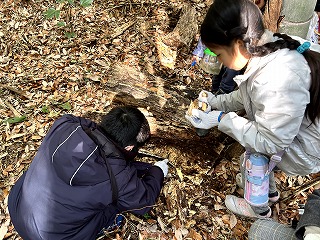 前半は、枯れ草の中にかくれて冬眠している虫や、小川を泳いでいる生き物に目をこらしたりした。竹灯籠の会のお話を少し聞き、竹林の中に倒れる朽木に到着。今日の参加者はカブトムシの幼虫には興味が高くなかった。クワガタの成虫(♂、♀)も何頭か見られた。クワガタは、木をキノコが食べて(分解させて)スポンジのようになったところを食べながら幼虫の時期を過ごす話を、木を見せながら話すと木の変化に不思議そうな顔をしていた。はじめは、手の上で死んだようにじっとしていたのに、あ、動いた!の声に誘われるように、そーっと、徐々にゆっくり動き出していた。コガタスズメバチや、ムカデ、マクラギヤスデ、ダンゴムシの越冬成虫も見られた。朽木の中にこんなにたくさん生き物たちが生きていることをすごい!とつぶやいたり、こんな所に何で?という疑問を持つ子もいた。