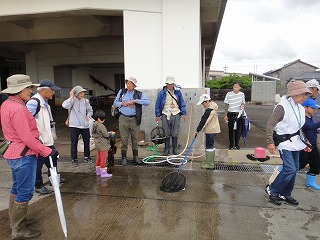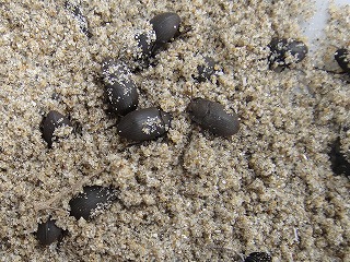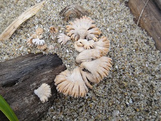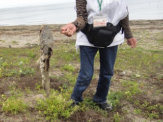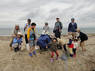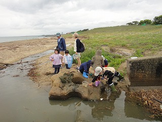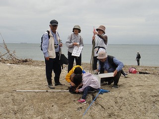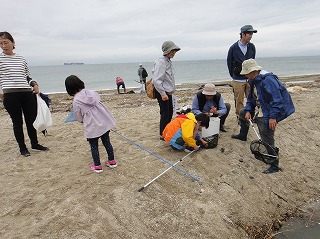 【内 容】下見及び虫トラップ設置: 5月11日実施、一般の方は広報とこなめと知多観察HPを見て参加されていた。当日は時々霧雨が降る観察会になりました。砂浜はハマヒルガオ、ハマボウフウ、スナビキソウ、ハマダイコンなど満開です。大人には海浜植物の開花や香りを楽しんでもらい、子供たちには砂浜に仕掛けた「落とし穴」カップにトラップされた土壌昆虫を観察してもらいました。スナゴミムシダマシが圧倒的に多くダンゴムシ、ハサミムシなども混じっていました。観察コース折り返し地点には排水路の潮だまりがありボラ、カタクチイワシ、ウナギなどの稚魚が群れていました。魚群がたも網を持参した子供たちを暫く夢中にさせてくれました。予定を15分ほど超える楽しい観察会になりました。(記・森田)