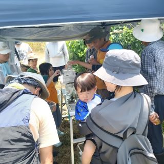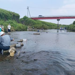 最初の挨拶で熱中症対策をお願いして川に向かった。前日アシナガバチの巣を退治しておいたので無事に下りていけた。榊原代表が投網を投げてくれたので、ボラやセイゴも捕まった。カワアナゴを初めて見ることもできたが、ウナギは捕まらなかった。川幅が広すぎるのか参加者からレベルが高くて捕まえれないなどの声が上がっていた。木陰もなくなってしまったので、分ち合いの時も暑かった。来年は場所を再考します。(記:平松裕)