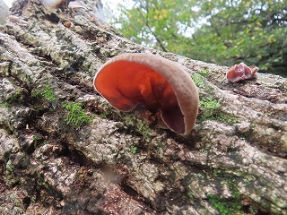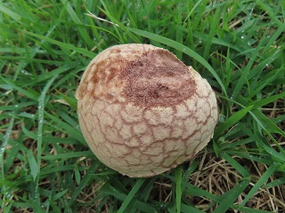 まず、宮池周辺。出発してすぐアカボシゴマダラ2頭を参加者が見つける。これだけ遭遇率が高いとすでに普通にみられる種となりつつあるかな?ジョロウグモの巣を観察。毎年この時期にたくさんあるジョロウグモの巣がほとんどない。芝生の上でしばし虫取り。バッタ類(オンブバッタ・カワラバッタ類)・ヤマトシジミなど。池では珍しいカルガモの白変種2羽を見る。池の中はカメ、大きなコイがいっぱい。草地の上にオニフスベと思われるキノコ発見。