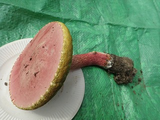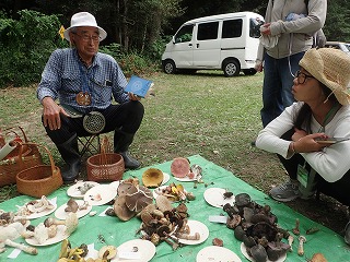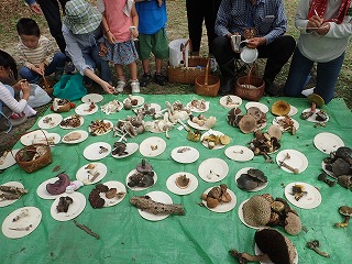 振り返りで、みんなの採ったキノコを持ち寄るとたくさんの種類のものが皿ごとに分類できました。シイタケみたいなスジのあるもの、カサの裏がスポンジみたいなもの、乾いた感じのものと、大きく3つのグループに分かれるという話の後にスポンジ状のは「イグチ」といってイノシシの鼻先のようという意味だと紹介がありました。日頃イグチは目にしない形なので皆さんうなずいていました。ホコリタケのような形のものが少ない気がしました。 (記:竹内秀)