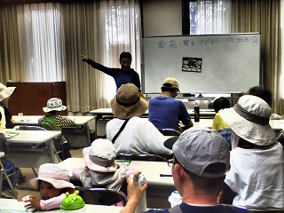春にトクサの草笛大会をした谷も、虫の魅力には勝てず草笛はスルー。そして視線は上の方。モンキチョウやモンシロチョウを追いかける。トクサの近くにあった野原のホットドッグ「ガマの穂」を初めて手にした、という親子もいて、今は固い茶色の部分は種になるということを聞いてさらにびっくりしていた。セミの抜け殻があちこちに見られたが、抜け殻の主は姿は見えても捕まえられなかった。(たくさんはいなかったけどね)セミは逃げるときに体を軽くしてぱっと逃げるためにおしっこをする。(でも樹液だから汚くないよ)と聞いて、ほっとした顔になっていた。