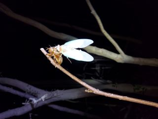 公園内を散策してみることとなり、ライトと虫網を持ち展望台コースへ。コースの道は幅もあり緩やかで小さな子供でも歩きやすそうに感じた。連日の猛暑で雑木林はやや乾燥気味だったが、コシアキトンボ、オオトモエ、カブトムシ(メス)、クワガタ、ヒバカリ(幼体)などが見られた。40分ほどの散策から再び灯火採集場へ戻ると、さらにたくさんの昆虫が白布の表にも裏にも集まって賑やかな様子になっていた。(記:纐纈)