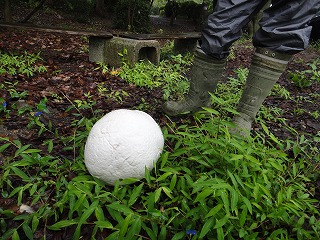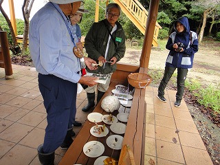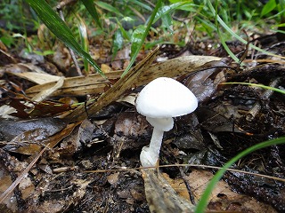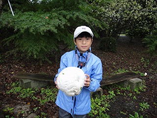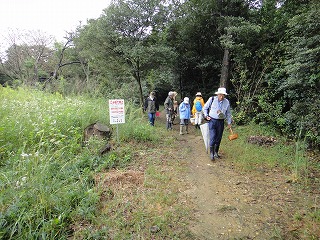 4日は昨夕から小雨模様、観察会開始後10時30分過ぎに雨は止み曇り空になった。山の斜面は滑りやすくなっているので観察範囲を平らな頂上周辺に限定した。頂上三角点までの雑木林林床には思いのほか沢山の種類のキノコが生えており参加者をキノコ探しに夢中にさせてくれた。折り返して大きな栗の木の下までの行程には秋の花ヒヨドリバナが群生し小鳥たちの声も冴えわたり小さな虫たちやにも出会えて満足できる観察会になった。