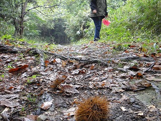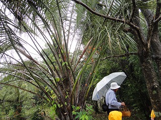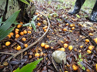 【左】会員持参のオニフスベ2個   【中】ヤシ科の植栽植物(結実落果)   【右】雑木林 林床を歩く