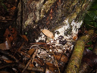 【左】オニフスベ   【中】菌糸で白くなった朽ち木   【右】ベニイグチ (老菌)