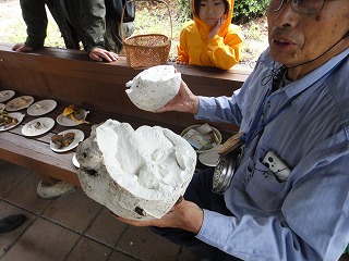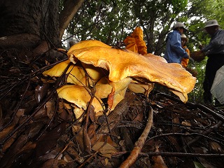 【左】キノコ講座     【右】オオワライタケ(老菌)に注目