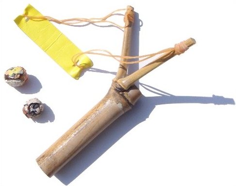 【左】上記掲載以外の遊び場のスナップ。写真クリック→ビッグサイズ 【右】遊びに使ったゴム銃…伐採の孟宗竹を利用