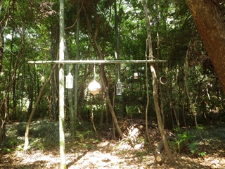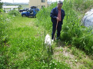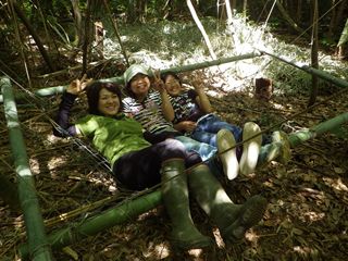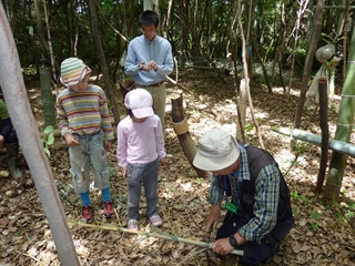 GWに連れてきたヤギのユキちゃんが人気者になっていました。正躬先生の作ってくれたブランコやハンモック、パチンコなど遊具が昨年よりかなり手が込んだものになっていて、参加者は大人も子どもも大喜びでした。筍もまだ残っていて筍堀も楽しみ、筍の簡単な茹で方やパチンコの握る部分の竹を切ってもらったりして親子で自然を満喫している様でした。(記:平松裕)