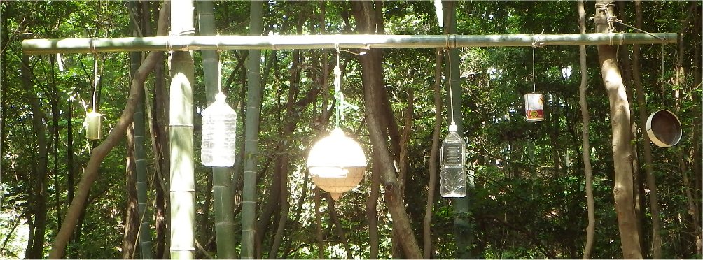 【左】始めのお話。竹林で思いっきり遊びましょう…  【右】ゴム銃(パチンコ)で“(まと)あて”遊び