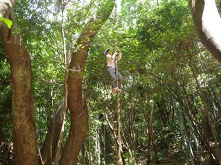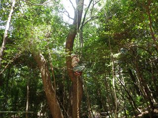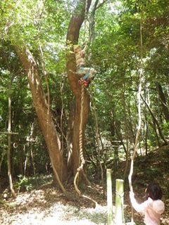 【左】天然の“フジつる”を登る。フジは太いクスノキの枝に巻き付いている 【中・右】同左。ことしは“木登り名人”が二人もいた