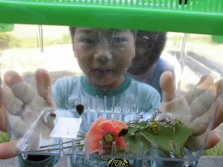 【左】みんな元気にパチリ!。 説明分かったかな?                【右】アオクサカメムシ.を見つけたけど臭いからとみんな退散