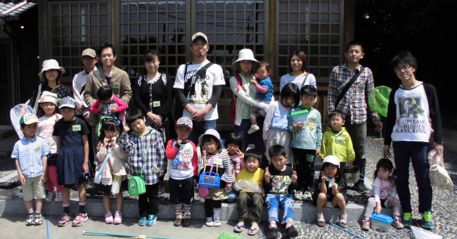 また、ナナホシテントウムシを20匹つかまえるのだとノルマにしている子も。みんな元気に走り回って“観察?“しました。 稲荷神社では「天然記念物」のマメナシの開花時期はずれていましたが、花とマメナシの写真に“ワーきれい”とか“小さいー!”との声。観察会が終わる頃に疲れてむずかる子もいて、賑やかな観察会でした。(記:吉川勉)