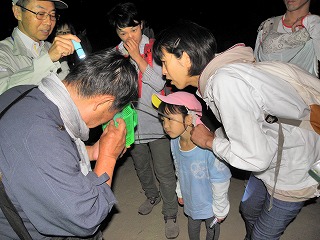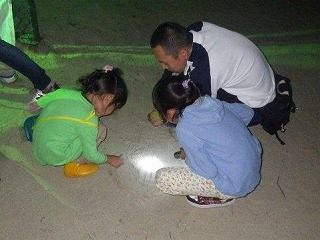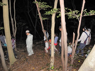 樹液の甘い香りに誘われ、足を止めた子ども達が木の幹を懐中電灯で照らす。キマワリやコガネの仲間は捕まるが、「クワガタだ!」などの歓声はあがらない。