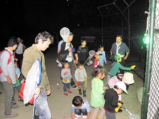 「さあ、ホタルはいるか・・・?行ってみよう。」藪漕ぎとまでは言わないが、夜の雑木林を通り抜けるなんて、なかなか楽しい体験。無事に田圃が広がる水路付近に着く。懐中電灯を消して目を慣らすが、月明かりの田圃からカエルの声が聞こえるのみ。ホタルを諦めて灯火採集のグランドへ戻る。