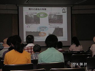 朝から夏の太陽がぎらぎら、元気なチビッコ達と保護者が集まりました。事務所3階の講堂で市担当者からこの観察会の取組みとJX日鉱日石さんの事業内容と工場内のビオトープとグルーンベルトの説明がありました。観察会時の注意事項と指導員の紹介後5班に分かれ観察に向かいました。クズのつたが生い茂った広場を過ぎはビオトープ池の観察にはいるとチビッ子たちはタモをかざしてチョウトンボはじめ9種のトンボやアオスジアゲハ、メダカを追って暑さを忘れては夢中になり観察会は盛り上がりました。池から離れたくない子供たちを諭しグリーンベルトの森に入り木陰の涼しさに大人たちはホッとしました。この森は40年を経過してクスノキをはじめ大きな木がうっそうと茂っていました。森を観察では期待したカブトムシは7匹ぐらいしか見つかりませんでしたが工場の係員の方が今後はこの森の樹木を外来種から、在来種に切り替えていく方向と話されていました。変わり行く腐葉土の多い豊かな森を期待して記念写真を撮って解散しました。(記:南川)