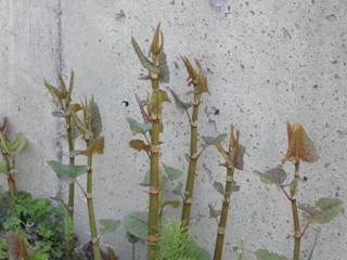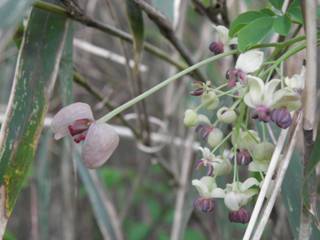 【左】ミツバアケビの花 【中】ツチイナゴ(成虫で越冬する) 【右】イタドリの背比べ