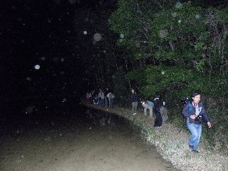 東浦町環境課募集による観察会。はじめて、集合場所をうのはな館駐車場とした。参加者は40人ほど、気温は低めだったけど蛍20匹ぐらい人間2人に一匹あたりはいたかな・・・?といった感じです。見られるポイントにつくまでに例年一,二匹は見られるのに一匹も見られなかったので、見られるかと心配しましたが、時間が遅くなるに従って、いつものポイントで1匹、また1匹と、ふわりふわりと飛び始めました。(思わず歓声!があがりました)ホタルのポイントの変化には、街灯の明かりや除草剤が関係しているような気がします。ホタルたちの年に一回のデートのじゃまにならないように懐中電灯は消して光を見つめます。おしりが光っているの?大きさは?といった疑問が聞かれたので、ちょっと失礼してホタル君にケースに入っていただきました。10時半頃になると、月が東の空から出始め、北斗七星に見送られ、蛙たちの鳴き声を聞き分けながら、11時近くに解散となりました。  1週間後の方がよく見られるかもしれない。ということでした。(記・竹内秀 )