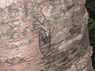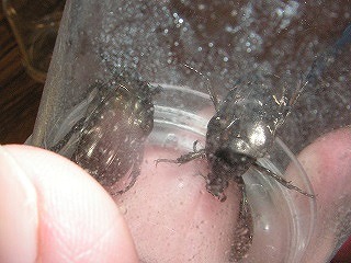 【左】カブト発見           【中】蛇が寝池のふちでトンボ採集です         【右】アブラゼミ