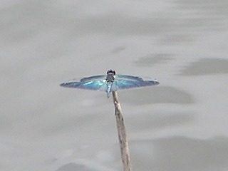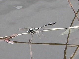 【左】チョウトンボ      【中】タイワンウチワヤンマ(蛇が寝池の水面を占有。外来の本種はウチワの形状が異る)      【右】ツクツクボウシ