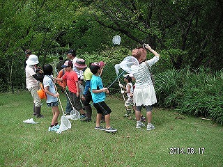 朝ドン曇り、観察会が終わるまでずっと曇りで蒸し暑い日でした。9:30から市職員のあいさつ、コース説明、指導員紹介の後、村瀬さんが注意事項を説明して観察に出かけました。いつものように「生きもの達の谷」を左回りに一周して生き物を探しました。土手の草むらにはショウリョウバッタが多く、イトトンボ(アジア)がうじゃうじゃいて驚きました。西の林ではカブトムシやシロテンハナムグリ、ゴマダラカミキリなどが見つかり子供たちが喜びました。次に「命の池」周辺を探しました。トンボやバッタが少ないながら見つかりました。そして「蛇が寝池」に向かいました。途中の草むらはバッタが多く、道端のどんぐりの木でカブトムシが見つかりまた盛り上がりました。蛇が寝池では時間が無くなり早々に観察を済ませて交流センターへ急ぎました。交流センターのレクチャールームで村瀬さんがまとめをしました。今回もみんなの虫かごに私の見てない虫がいっぱい入っていていつもながら多くの目はすごいと思いました。特にウチワヤンマを捕らえた門脇さんには皆感心しました。捕まえた虫はすべて放すことにして観察会を終了しました。(記・平松俊)