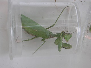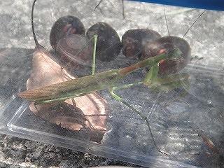【左】ボードを使って見つけた生き物を書き出し 【中】チョウセンカマキリ 【右】ハラビロカマキリ(外来のムネアカではない)