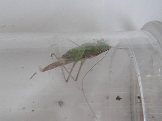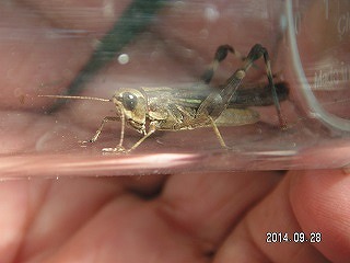 【左】ホシササキリ 【中】ホソヘリカメムシ 【右】マダラバッタ(後足脛部が赤青黒白のまだらです)