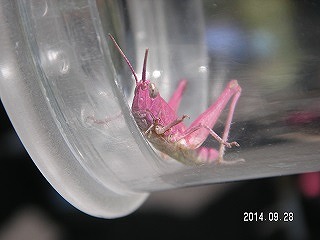 【左】植物の説明をしています 【中】ピンクのバッタがいました 【右】園路を歩きながら生き物探しです