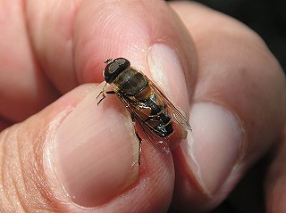 【左】ウスバキトンボ(あちこちで) 【中】シマハナアブ?(林縁でホバリング) 【右】折り返し点で生き物探しです